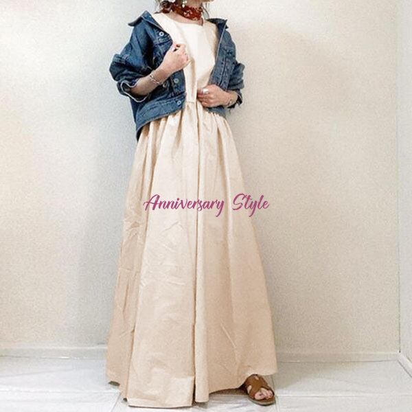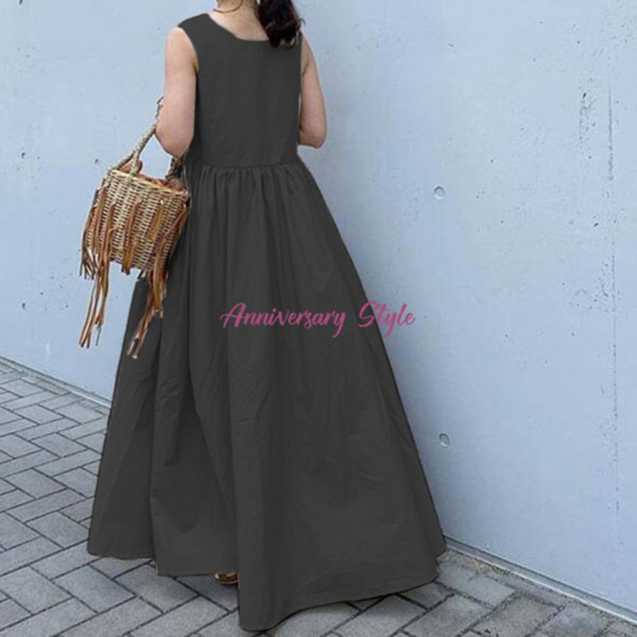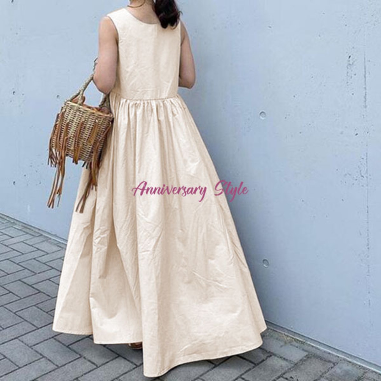 Vネックと袖なしデザインが女性らしさを引き立て、胸下の切替がウエストを細く見せてくれます。さらに、ギャザーが入ったフレアーのシルエットで、縦長効果とともに、ふんわりとした自然な動きが魅力的です。ラインはマキシ丈で、レッグラインを隠してくれるため、気になる太もももカバーしてくれます。