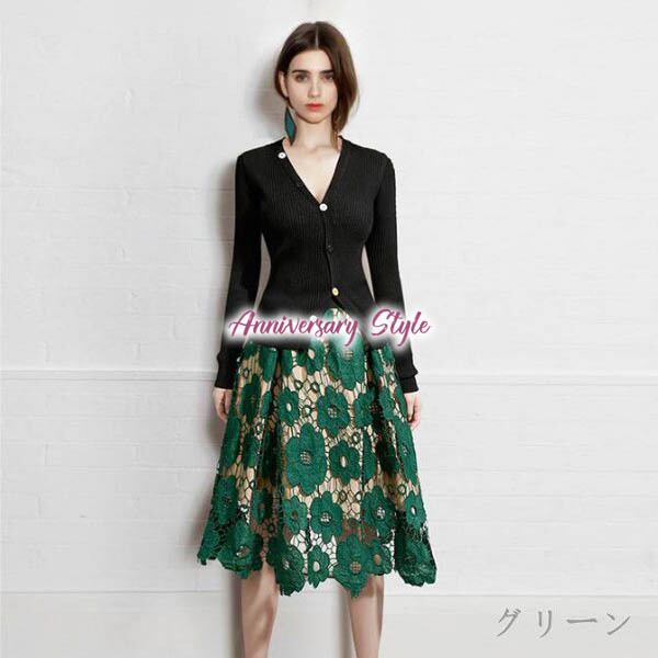 スカート L-5L 黒 緑 赤 膝丈 ミモレ丈 ミディアム丈 クロッシェレース 透け編み 大人可愛い 2534366 きれいめ キレカジ パーティー グリーン ブラック