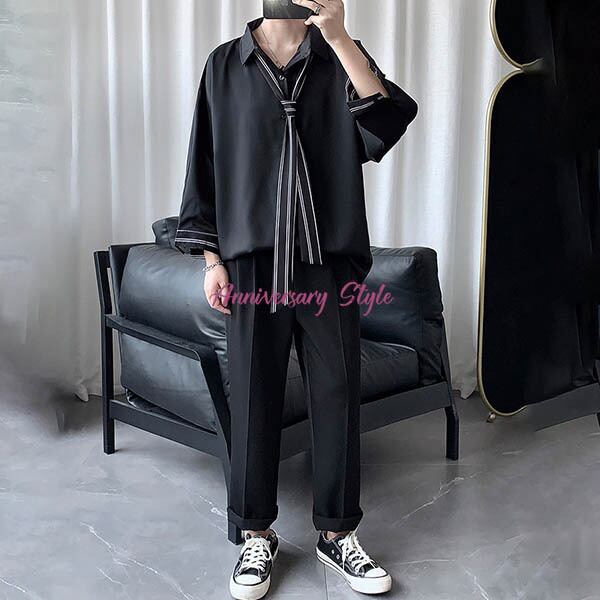 シャツ ユニセックス ネクタイ付 メンズ レディース 男女兼用 黒 M L 2L 3L 即納 トップス 5111665 ワイシャツ ラグランスリーブ 七分袖 グレー 白