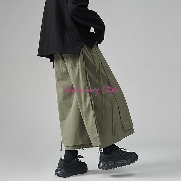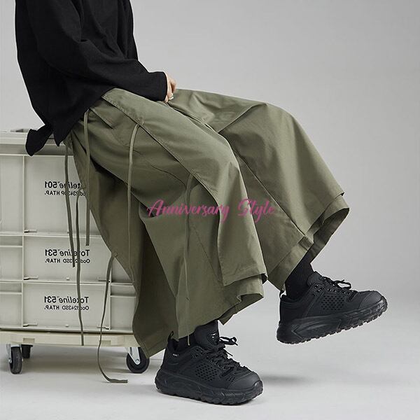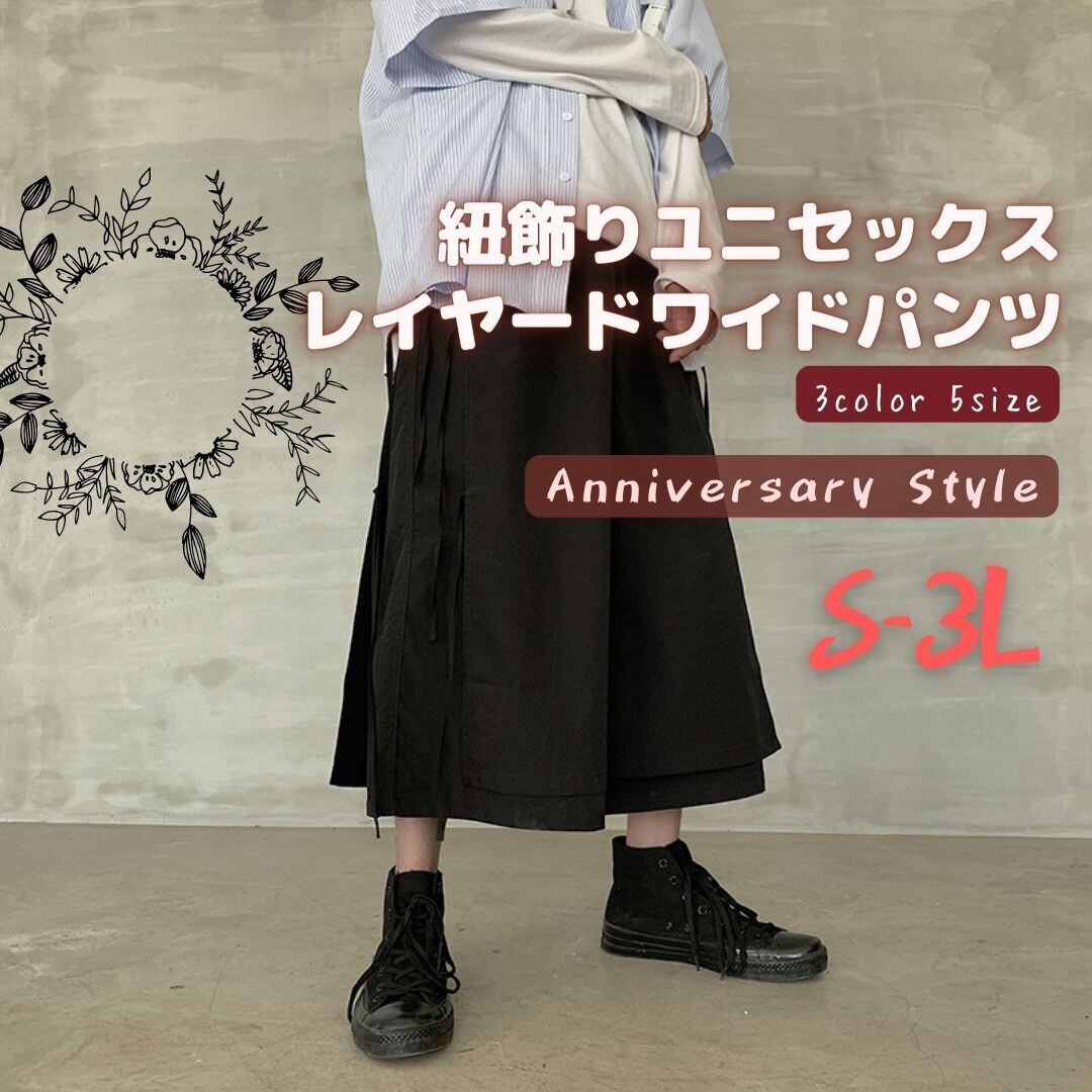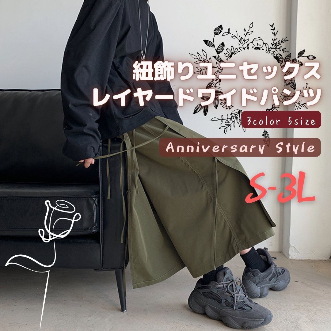 ワイドパンツ ユニセックス メンズ レディース 男女兼用 S M L 2L 3L ガウチョ 9679196 グリーンSL黒L即納 黒 ベージュ レイヤード 飾り紐