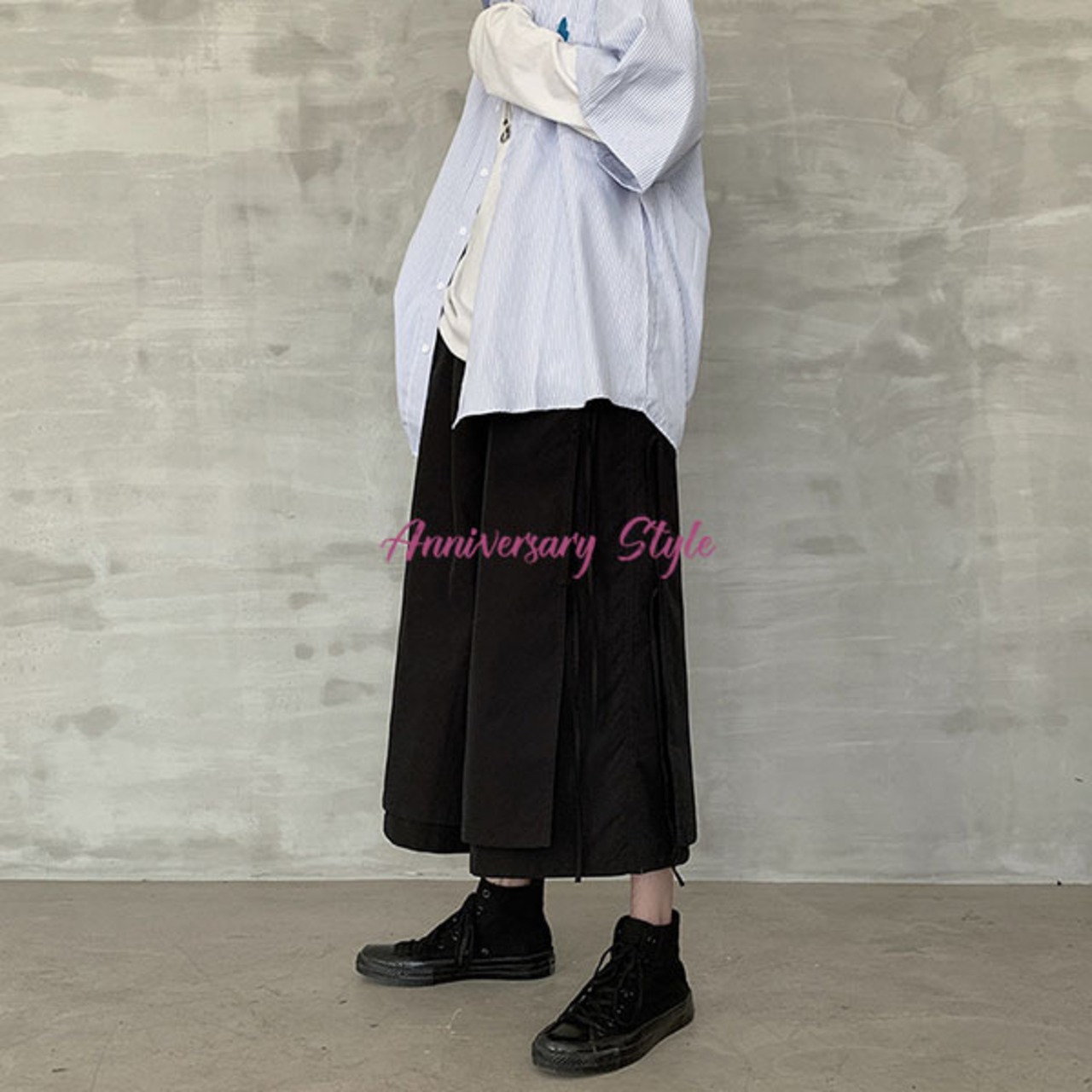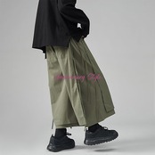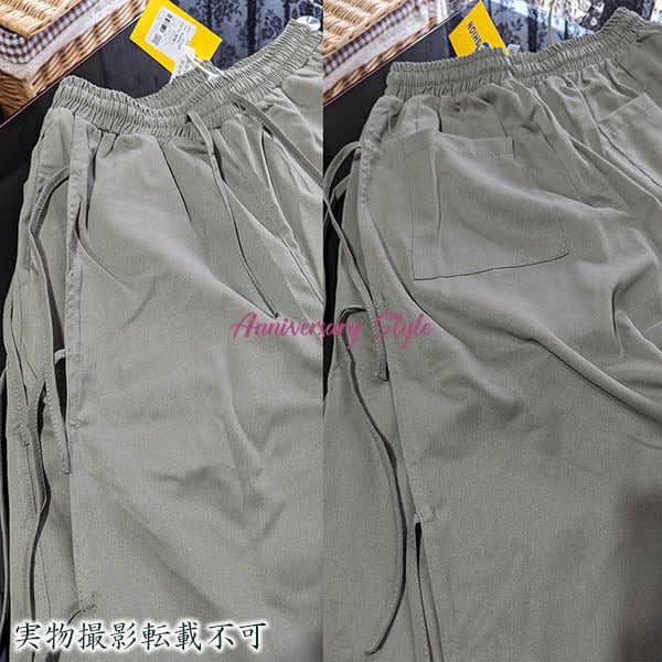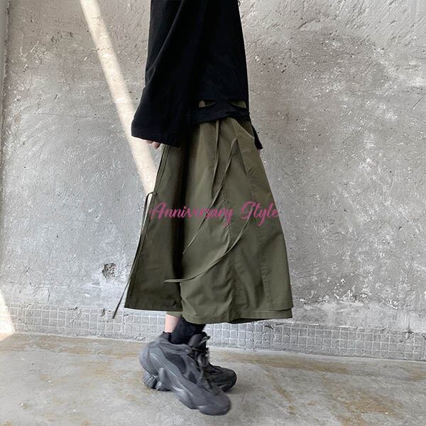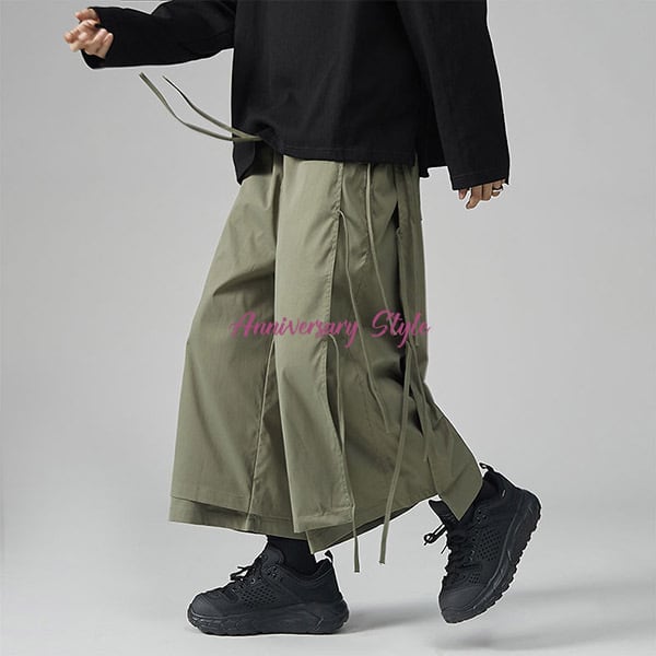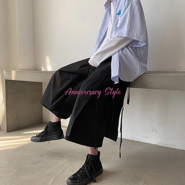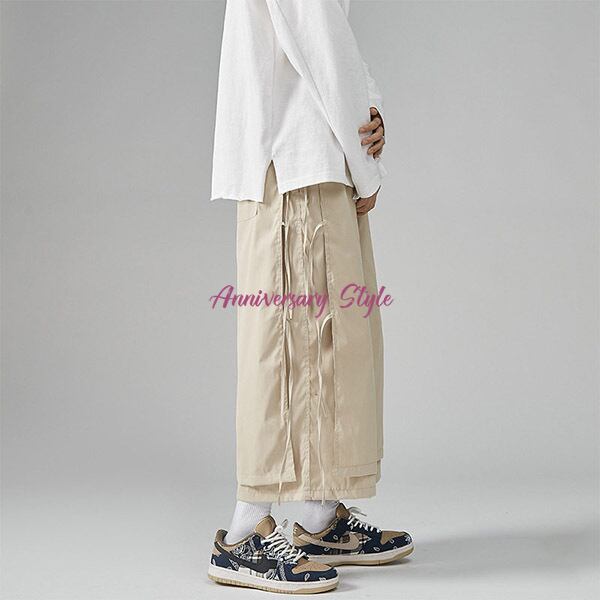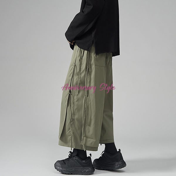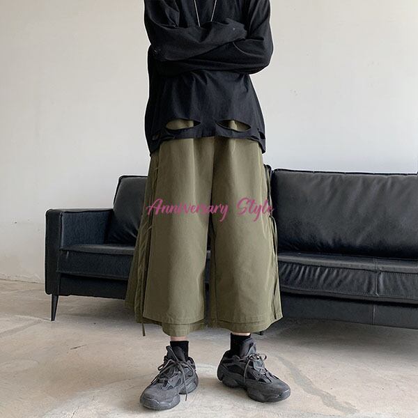 メンズレディース男女兼用ユニセックス的な魅力のレイヤード風2重仕様飾り紐がおしゃれなクロップドガウチョワイドパンツ。